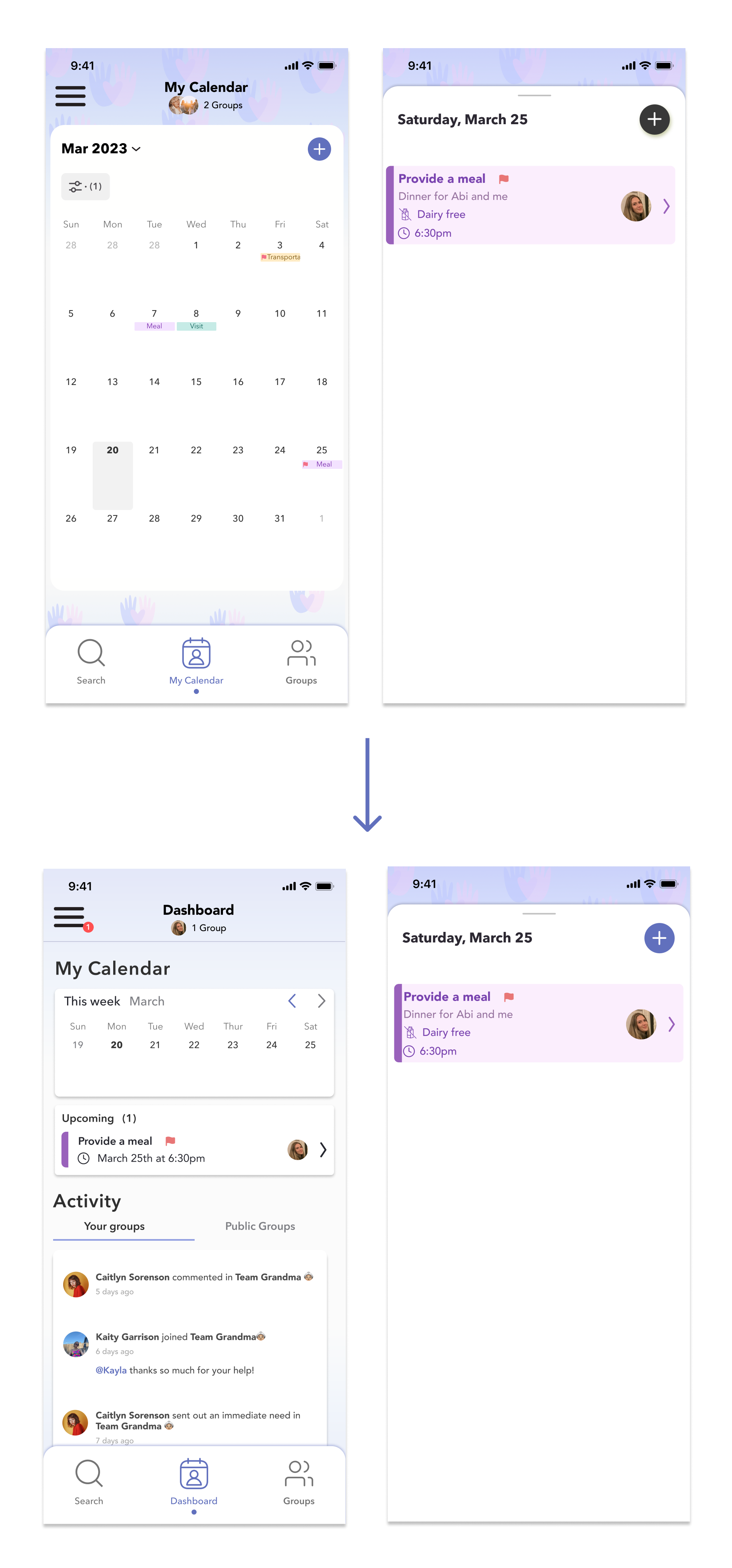 Instead of the user’s home base being their calendar, I created a dashboard so that users could have a place to quickly reference their week at a glance and also see the recent activity from the groups they have joined.